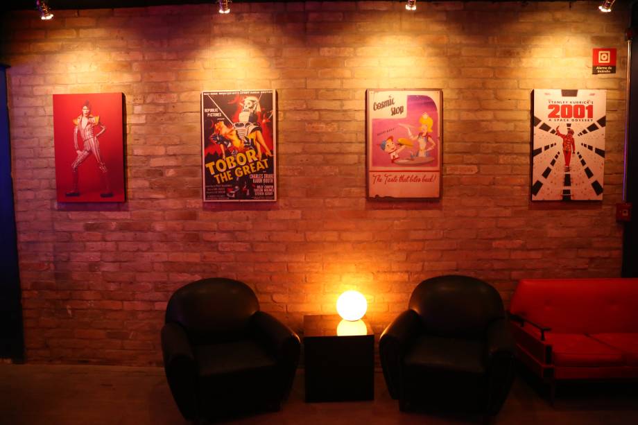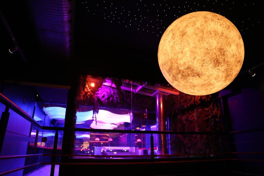 No teto, as luzes simulam uma noite estrelada e um círculo que lembra a lua ilumina o salão. Cartazes evocam filmes conhecidos a exemplo de 2001: Uma Odisséia no Espaço e artistas do naipe de David Bowie.
