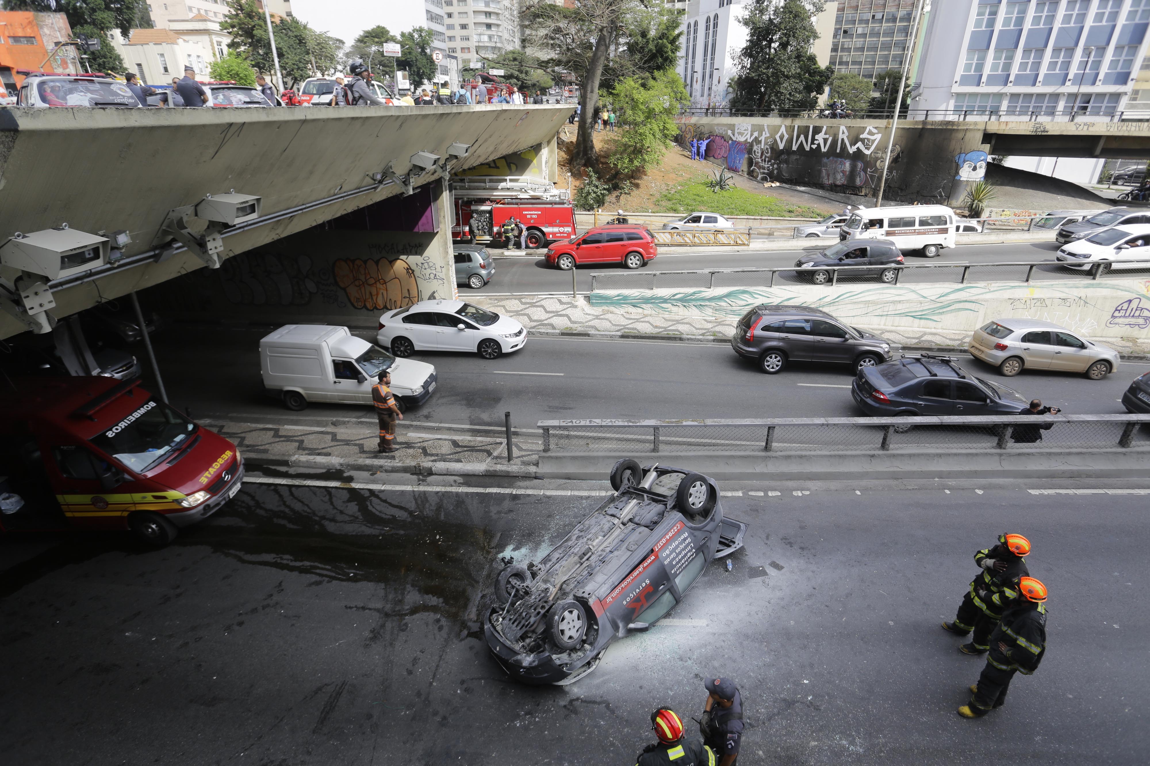 A batida ocorreu no sentido bairro da Rua da Consolação entre dois carros. Com o impacto, um dos veículos capotou e despencou até o acesso ao elevado. A via ficou bloqueada até as 11h50, segundo a Companhia de Engenharia do Tráfego (CET). Cinco viaturas dos bombeiros foram deslocadas para o local.