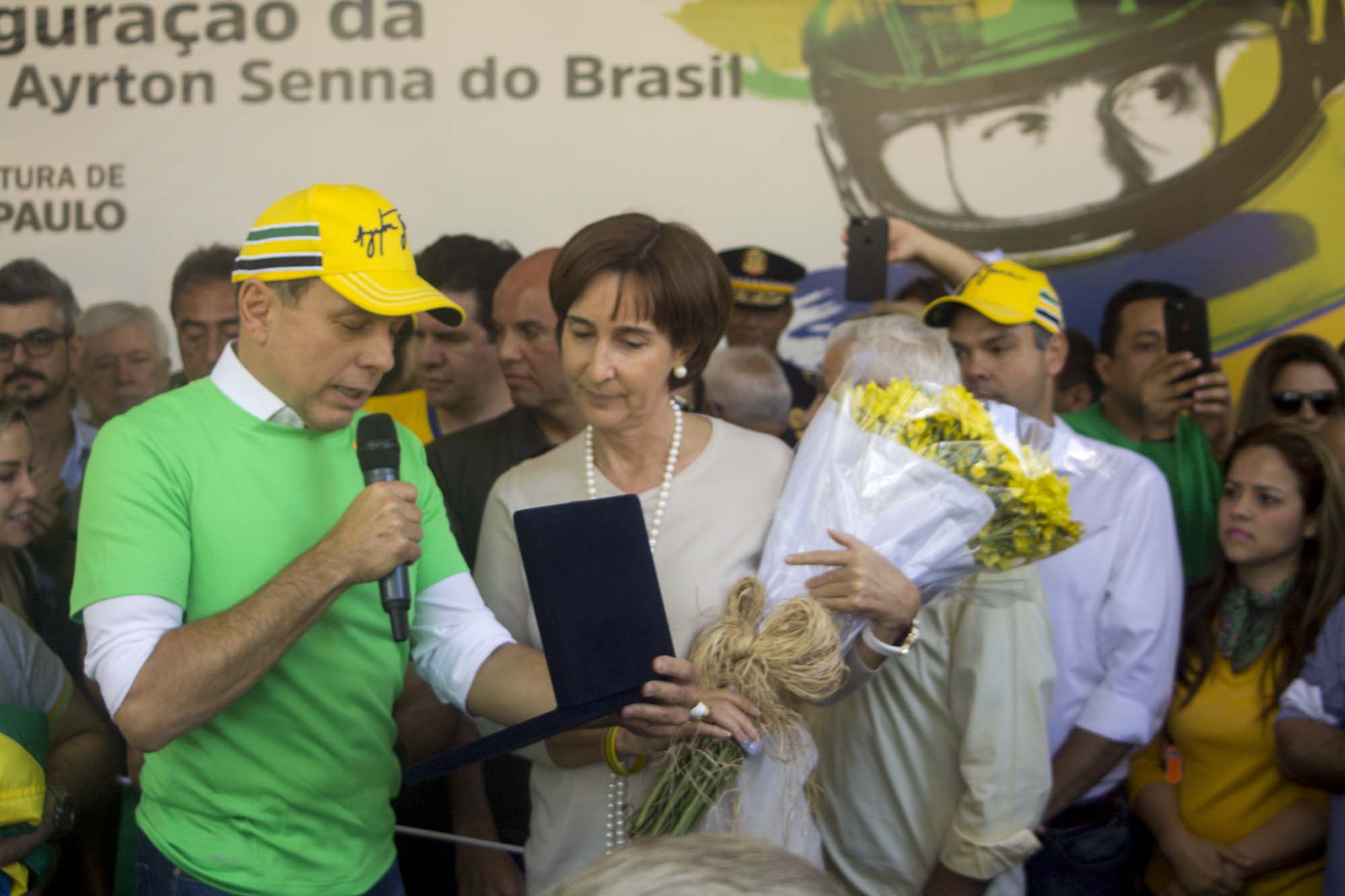 Nesta segunda, no palco da cerimônia de inauguração da praça, o prefeito voltou a receber flores, mas em homenagem feita pela presidente do Instituto Ayrton Senna, Viviane Senna.