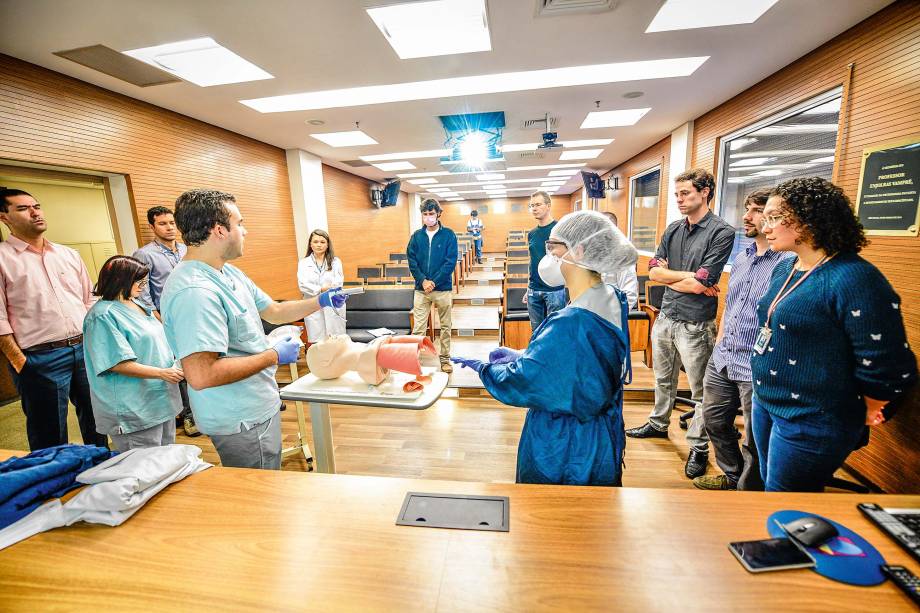 Se fosse uma cidade, o Hospital das Clínicas teria uma população do tamanho da de Mococa, no interior paulista. Por dia, além dos 21 000 funcionários, passam 45 000 pessoas, número que caiu para 27 000 em março. Outra queda foi no número de operações e procedimentos. Entre janeiro e abril, as cirurgias eletivas caíram 25% e em abril esse número sofrerá um declínio muito maior. Por outro lado, o que não para de subir é o uso de máscaras. Antes da pandemia, eram consumidas 4 000 unidades cirúrgicas por dia. Agora, o número foi multiplicado por três e o hospital trabalha em um processo piloto de reutilização de alguns modelos.
