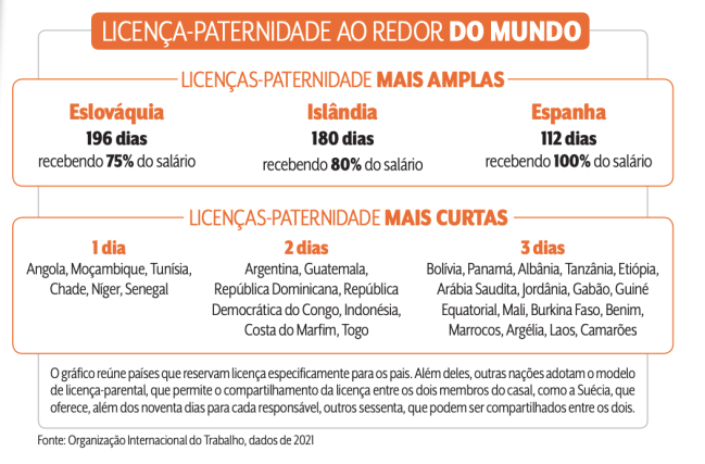 A situação do Brasil pode mudar com a discussão sobre extensão da licença que deve ser pautada no congresso nos próximos meses. Prevista no artigo 7º da constituição Federal, a licença-paternidade é um direito dos trabalhadores, mas o texto não determina a duração do afastamento. Os cinco dias corridos aplicados atualmente no Brasil são previstos em uma disposição transitória constitucional — que, apesar de transitória, já vigora há 37 anos. “Não houve um interesse legislativo em tratar da matéria como ela deveria”, explica Silvia Felipe Marzagão, presidente da Comissão da Advocacia de Família e Sucessões da OAB-SP.