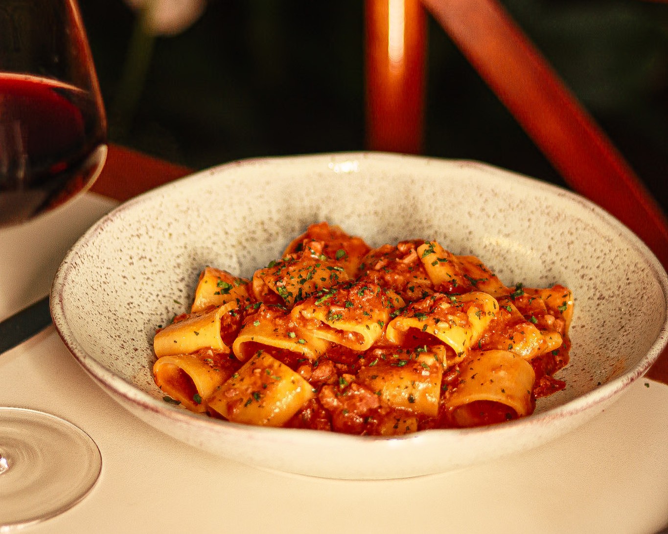 A clientela pode provar pelo preço fixo de 180 reais o paccheri della fattoria (de formato cilíndrico grande ao molho de tomate, queijo parmesão e ragu de linguiça; 89 reais), o rigatoni all’amatriciana (também de formato cilíndrico ao molho de tomate, guanciale e queijo Vale do Testo com seis meses de maturação; 92 reais) e espaguete cacio e pepe (molho de queijo Vale do Testo, água do cozimento e pimenta-do-reino; 92 reais) — os preços entre parênteses correspondem aos valores individuais do cardápio regular.