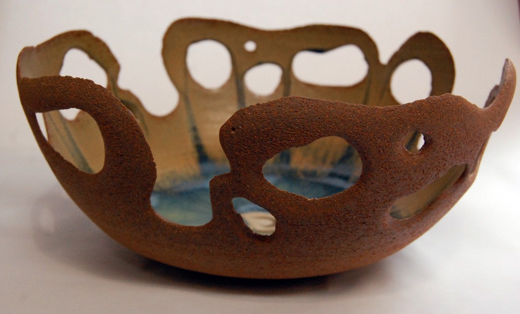 Sempre quis fazer quer uma peça mais alta, mas o problema é não se consegue enxergar o interior. Só se fosse vidro que tem transparência, é translúcido. A partir desse desejo, comecei a fazer objetos vazados para que as pessoas pudessem ver o interior [podem ser usados como centro de mesa ou mesmo como fruteiras]. Gosto muito que as pessoas olhem através dos buracos porque a parte exterior da peça é áspera, mais grosseira em contraste com o interior que tem o brilho do esmalte.