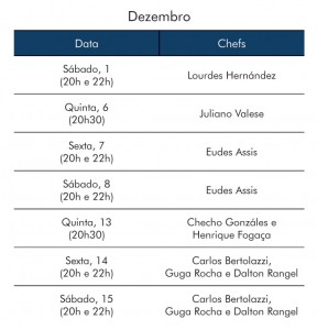 De vida breve, o restaurante instantâneo tem como data marcada para funcionar — 7 de novembro — e para terminar — 15 de dezembro (o calendário você confere abaixo). Doze chefs, sozinhos, em duplas ou trios, assumem o comando do fogão em datas diferentes. Eles preparam sempre menus completos, compostos de duas entradas, prato principal e sobremesa. Sem bebidas, o preço fixo é de 70 reais (quarta), 80 reais (quinta) e 90 reais (sexta e sábado).