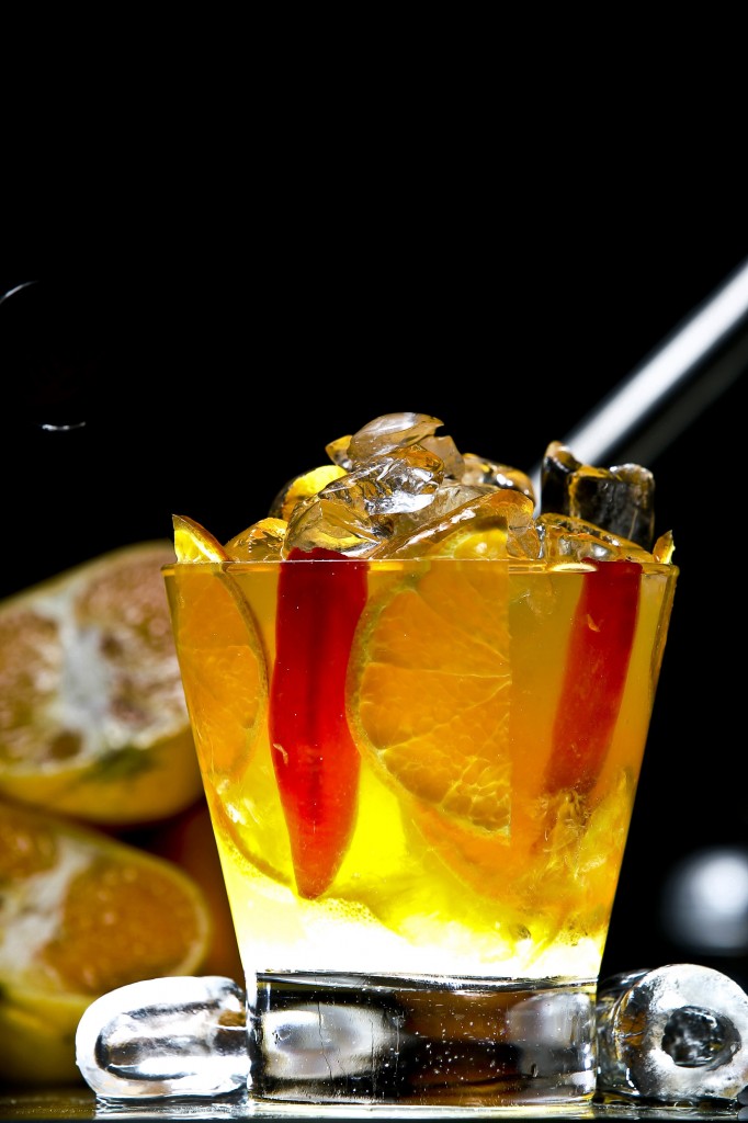Fatie a tangerina em pedaços finos, acrescente o açúcar, macere levemente e encha o copo de gelo. Corte uma pimenta dedo-de-moça e coloque-a na lateral do copo. Dica de cachaça: Germana.