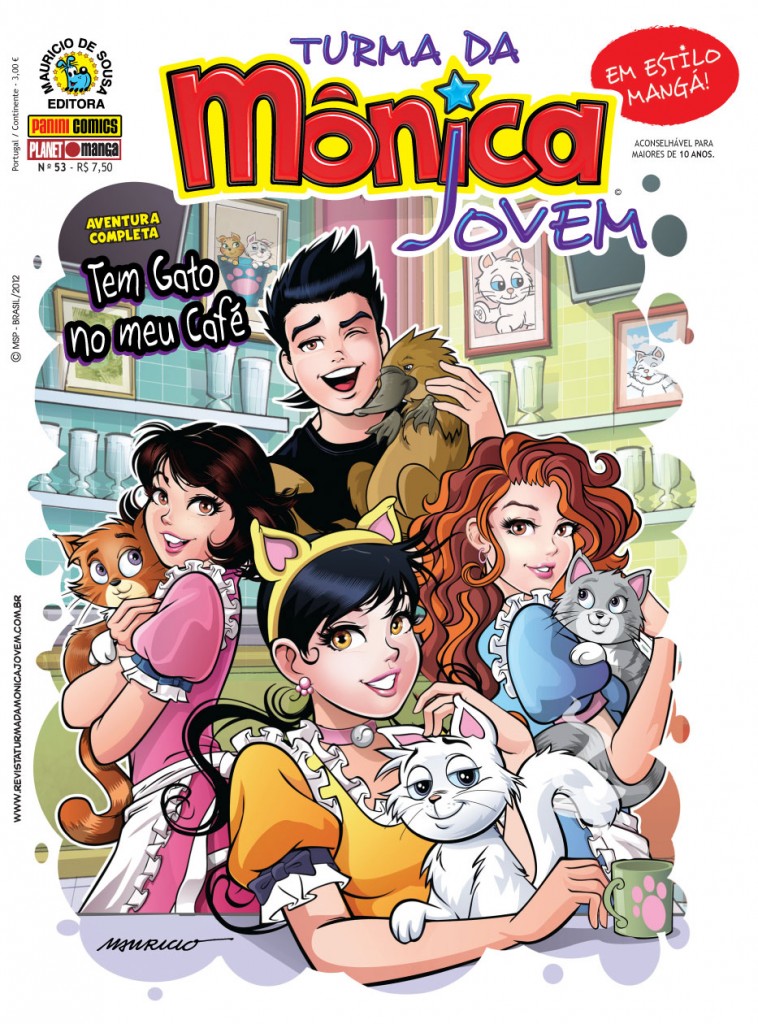 No gibi Turma da Mônica Jovem, os personagens clássicos de Mauricio de Sousa Mônica, Cebolinha (agora chamado de Cebola), Cascão e Magali aparecem em versão adolescente e em traço de mangá. Claro que os teens são o público-alvo, mas os adultos também podem gostar dos quadrinhos. Ainda mais esse mês, em que a edição traz um tema que interessa a muita gente (inclusive a mim): gatos.