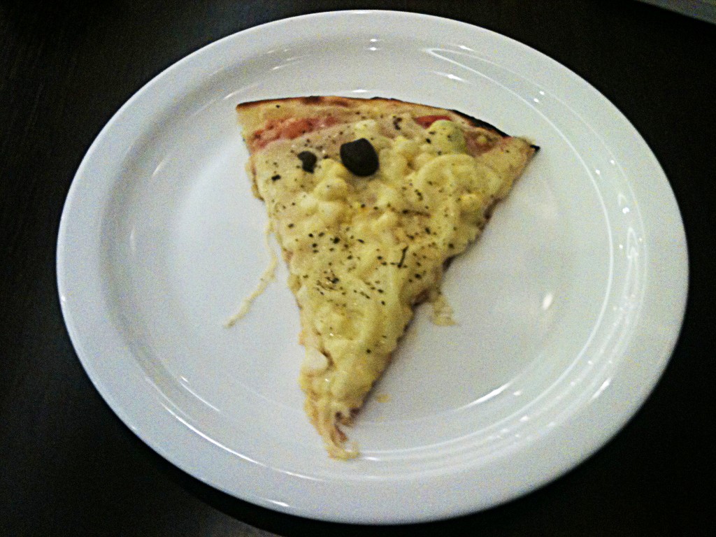 Mas o meu ponto de interesse está no trivial balcão mesmo. No dia da minha visita, três pizzas estavam ali. Pedi uma fatia da portuguesa, por R$ 6,20.