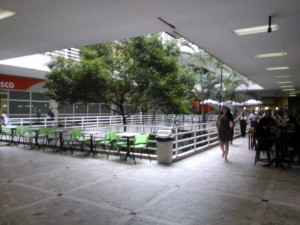 Os corredores circundam o vão central. Ao fundo, a torre de escritórios (Fotos: Mariana Barros)