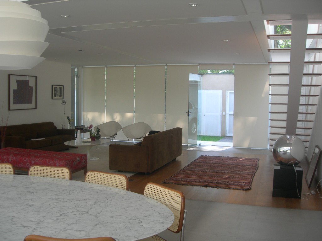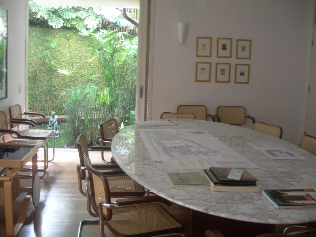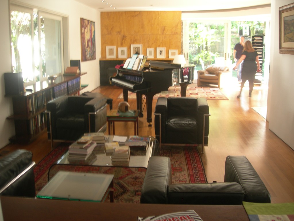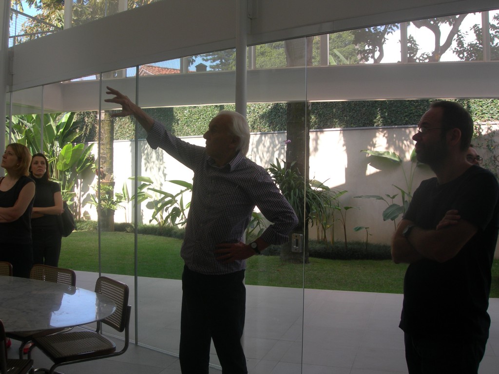 A primeira parada foi uma casa projetada por Oswaldo Bratke no Jardim Europa. Construída em 1947, ela recebeu uma bela reforma orquestrada pelo arquiteto Mauro Munhoz em 2000-2002. O terreno, assim como o resto do bairro, fica sobre um lençol freático que se move, ainda mais após décadas de construção de subsolos e piscinas nas redondezas. Com isso, parte das estacas de madeira ficaram acima do nível da água e acabaram apodrecendo. A inspiração de Bratke para esta casa veio de Frank Lloyd Wright e da ideia de que é possível (e interessante) desintegrar o conceito de cubo que existe por trás de uma casa, propondo espaços em que interior e exterior conversem e se misturem. Boa parte das paredes da casa se move sobre trilhos, criando diálogos entre as salas ou para o jardim e a piscina. A sensação é de que os espaços vão se abrindo, convidando a percorrê-los.