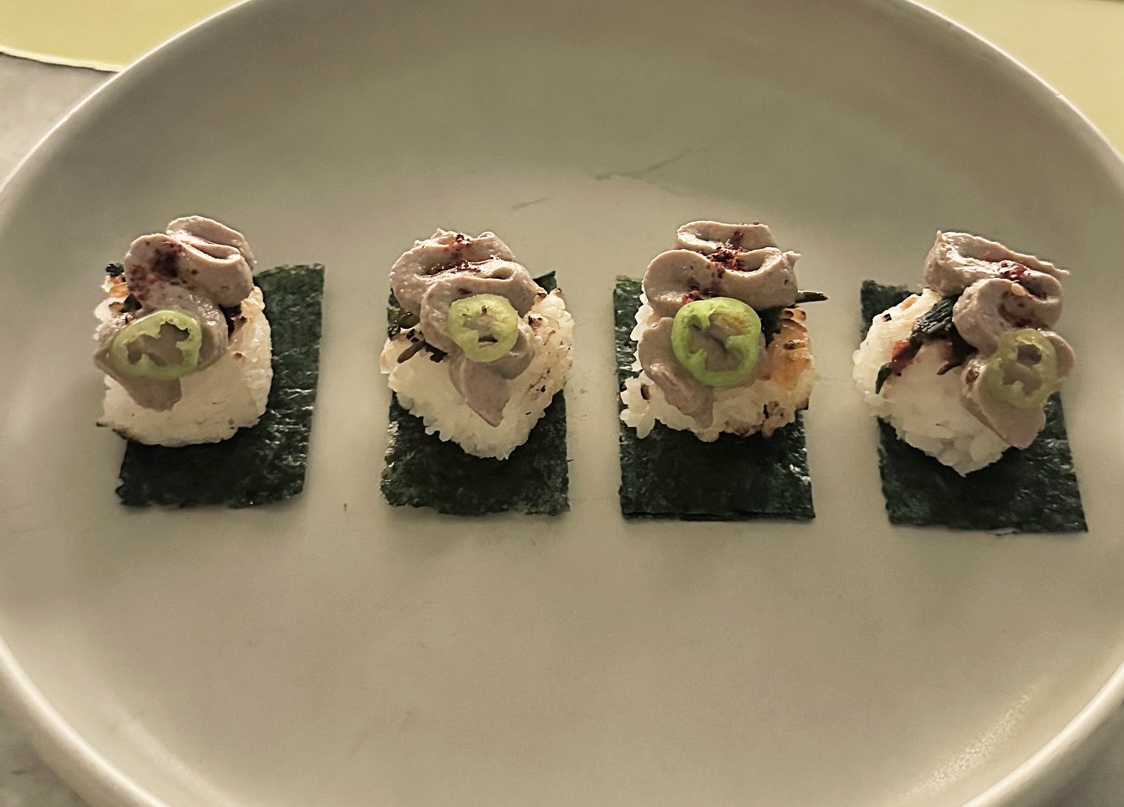 De comer em bocados, o arroz moldado na forma de pequenos oniguiris tostados recebe por cima kimchi de nirá, patê de fígado de pato e jalapeño para serem embrulhados em alga nori (R$ 39,00, quatro unidades).