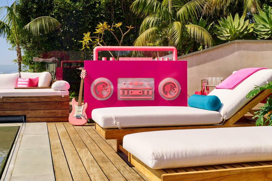 São dois quartos e dois banheiros, com toques de pink em todos os cômodos. A locação tem piscina de borda infinita, cinema privativo, estúdio, quadra de esportes e espaço para refeições ao ar livre.
