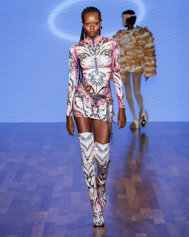 Vestida como uma ciborgue, a atriz fechou a apresentação do estilista Dario Mittmann, que propõe uma reflexão sobre o mundo pós IA
