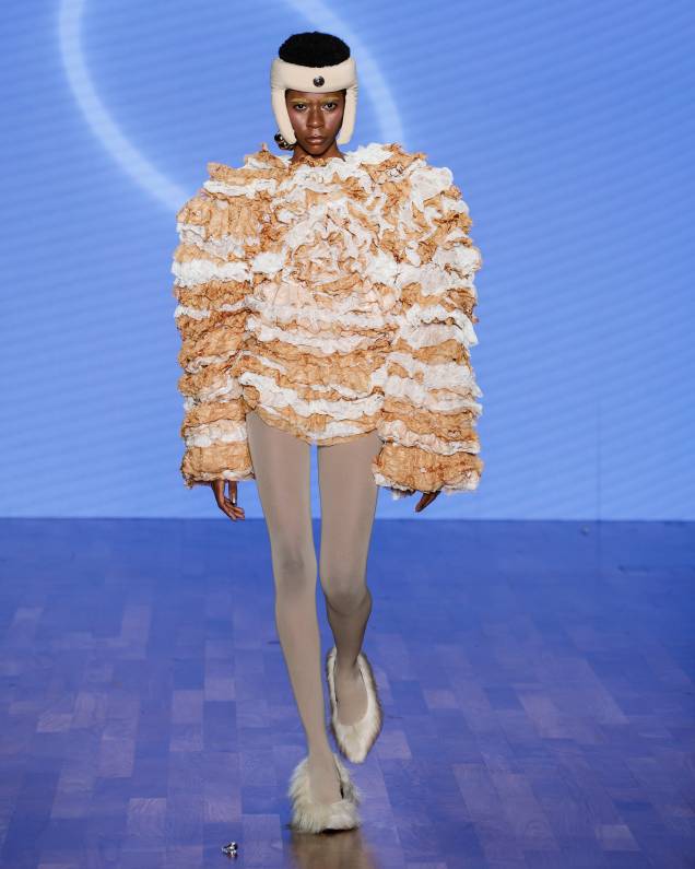 Com figuras que causam estranhamento, o desfile propõe uma crítica sobre o avanço tecnológico e seus impactos na consciência e na existência.