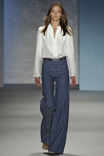 Boca-de-sino chique: saltos ajudam a alongar a silhueta, como mostra o desfile do estilista americano Derek Lam (Foto: Getty Images)