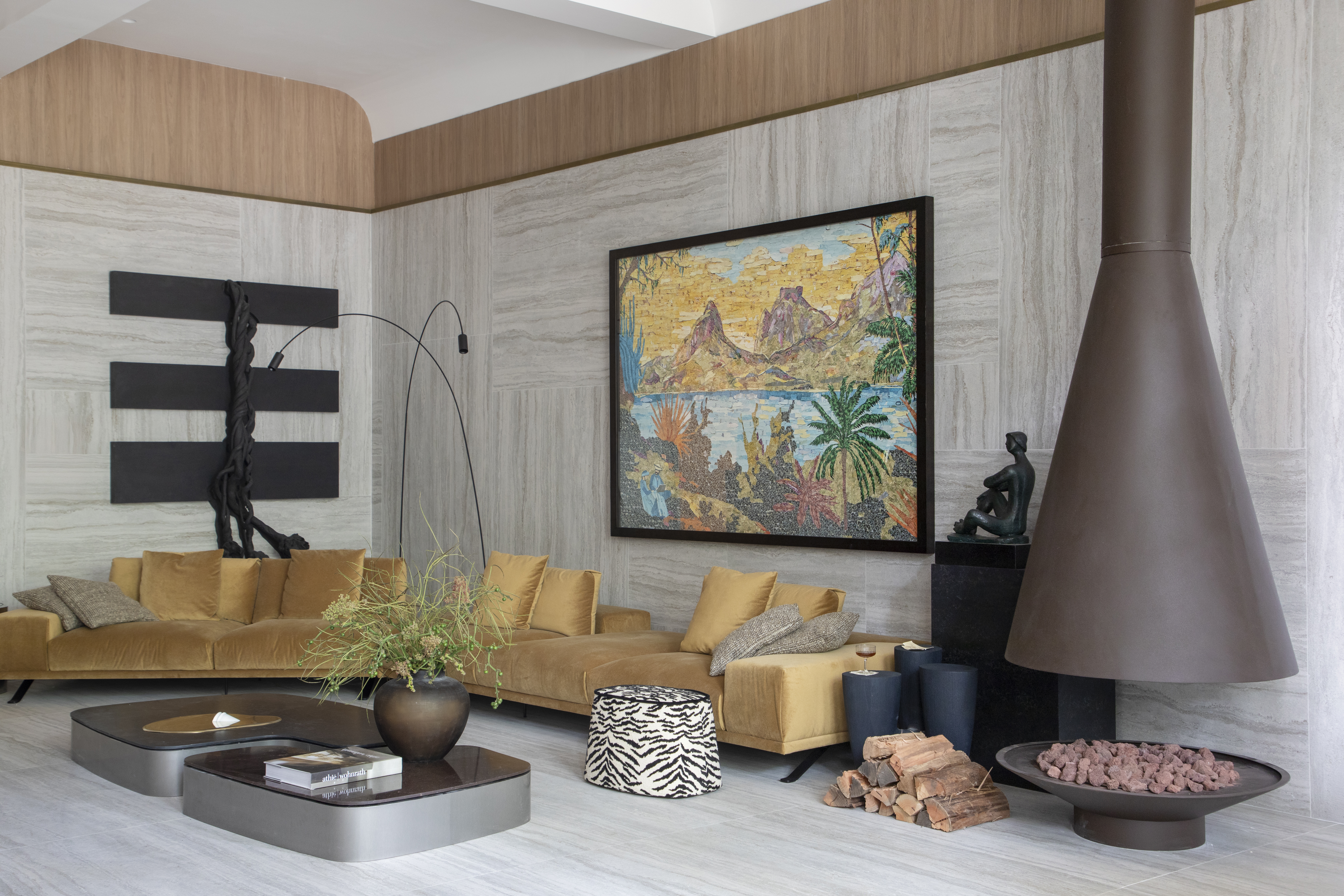 O mote do ambiente está logo acima do local de aquecimento: um relógio esculpido na mesma peça de mármore. A ideia é gerar uma reflexão sobre tempo e pausa. Outros materiais naturais e a iluminação cênica contribuem para o clima de aconchego, assim como a famosa poltrona Jangada, de Jean Gillon.