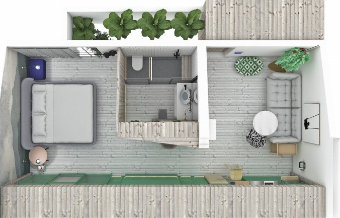 À primeira vista, o espaço não parece ter nenhuma adaptação para moradores da cabeça prateada. Câmeras e outros equipamentos para evitar acidentes, por exemplo, ficam escondidos. O mesmo vale para os puxadores próximos a porta, com visual que passa longe do clima hospitalar. Para evitar quedas, não há tapetes.