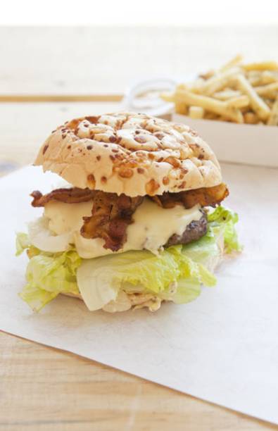 O sanduba Califórnia Funcional leva pão integral, hambúrguer com aveia, cebola-roxa, rúcula, creme de ricota e mostarda.