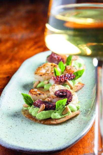 Parece um bar em miniatura. Com apenas vinte lugares — incluindo dois da minivaranda —, o espaço se configura em um corredor com um lustre de penduricalhos. Fica no piso de cima de um empório e no imóvel anexo ao pizza-bar GattoFiga, estabelecimentos com sócios em comum. Sem tanto esforço de garimpo, mas com sugestões para diferentes paladares, a carta apresenta 44 vinhos — doze deles ficam em máquinas que permitem que seja servida apenas uma dose (50, 100 ou 150 mililitros), conservando o resto do líquido. A jornada pode iniciar com o branco espanhol Marqués de Tomares Crianza Blanco 2020 (R$ 219,00), elaborado com viúra e garnacha branca. Os comes se dividem entre “aconchegantes” e “refrescantes”. Dessa última linha, um destaque é o canapé de frutos do mar ao pesto de hortelã, rúcula e mascarpone no biscoitinho crocante de massa de pizza (R$ 78,00 a porção).